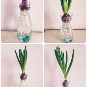 今年は水栽培を頑張ろうと、気合を入れてネットで球根を購入。冷蔵庫で芽を出させた後の経過です。 茎がグネ〰ンとなりました😂 どうやら光が足りなかったようです🥺