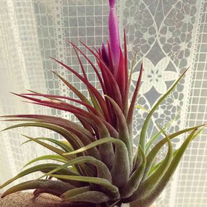 リビングの入り口につけたチランジア。 家にあった麻紐を適当に三つ編みして、所々に挟んだだけ。 長さも適当だし、サイズも種類もめちゃくちゃ。もっと手をかける人はちゃんとやるんだろうけどなぁ… 高いのとか、安いのとか、レアのとか、全然知らない。 ただ、自分で適当につけただけ。 私は、カプトメデューサエとか、ブッツィとかの火の玉型が好きらしい。