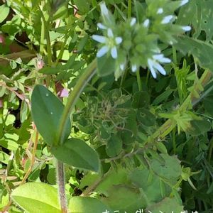 オランダミミナグサ ハコベの仲間で、一緒に生えていることが多い 葉っぱの形がネズミの耳に似ていて、 かつ食べられるということから、 耳と菜で耳菜草(ミミナグサ)となったらしい