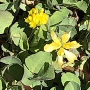 駐車場の脇にありました。 黄色い可愛らしいお花。 コメツブツメクサか、コメツブウマゴヤシ だと思うんですけど、花も葉っぱもとても よく似ていて、わからない。(*´ο`*)=3 ポイントは、花序の花の数くらい。 でも花が小さすぎてよくわからないよ〜