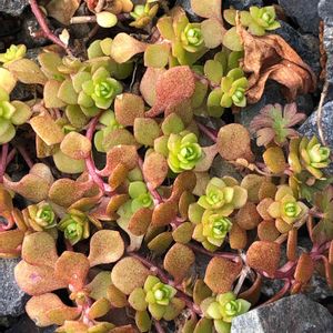 多肉っぽい植物が庭のあちこちに生えてます。 以前からあったんですが、特に気にしていなかったんです。 マンネングサの仲間かと思うのですが、どなたかわかりましたら教えて下さい。 寒くなると葉っぱが、このように赤くなります。 チョコさんがマルバマンネングサと教えて下さいました。