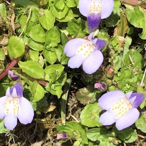上 トキワハゼ 下 ムラサキサギゴケ 上は家の周りの石垣などにたくさん、 下は田んぼの畔にたくさん咲いています。 どちらもゴマノハグサ科サギゴケ属 よく似てますね。(⑅︎•ॢ◡︎•ॢ).。*♥︎