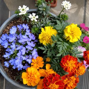 賑やかな寄せ植え出来ました😄 マリーゴールドが元気いっぱい✨ ロベリアはもっと広がってくれるかな❓💕