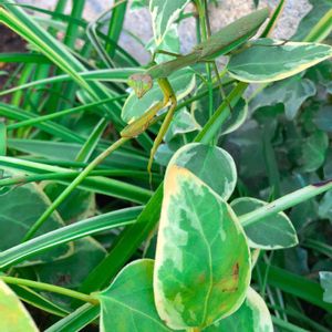 ⚠️虫が苦手な方ごめんなさい⚠️ 家の東側の不毛地帯。ツツジを何度か植えたのですが枯れてしまい、土を入れ替えてもすぐサラサラ、パサパサに。 仕方なく、丈夫なグランドカバー的なものを植えていますが、ここに何故かよくカマキリちゃんが来ます。見事な保護色✨