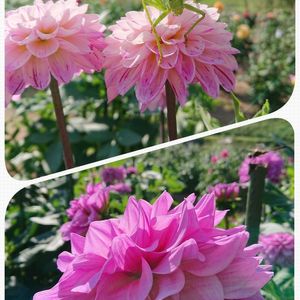 『秋田国際ダリア園』3️⃣ ⬆️21-Y3 「この子は僕が守る」と言ってるような大きなバッタさん付き😆 ⬇️ライラックムーン🌕️ 微妙なフリルも色合いも素敵🥰 支柱にはトンボだらけです😅