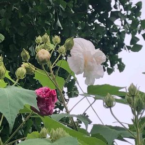 公園で見つけました。😀 酔芙蓉🌸スイフヨウ 午前中、八重のフヨウの花、まだ白い 下の方にしぼんだ紅色の花 初めて見ることができました❣️