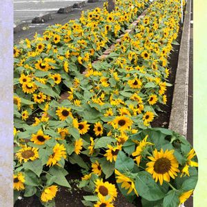 ご近所の、HCの ミニひまわりが植えられたボーダーの花壇 🌻