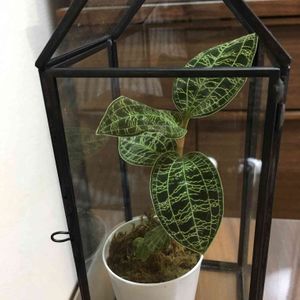 箱入り娘のマコデスペトラ。 カインズで小さなガラスの入れ物を買ってあげたけど、狭そうです😅 深緑のベルベットのような質感と金の葉脈が本当に美しい…💕 葉っぱをなでなで触ってみたいんですが、こわくて触れません😩