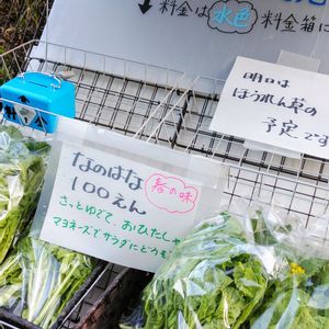 春になってきたので、リニューアルした無人野菜販売所少しずつ再開していきたいと思います。 自宅前の斜面に立て掛ける仕様にしてみました(^^;) 今日の野菜は、とりあえずいっぱい採れた菜の花です(^^;) こちらの販売所で、ゆくゆくは増やした多肉植物を販売できたらなぁと(;゜O゜) うまくいくかは不明ですが(笑)(^^;) そして、投稿した写真を見て漢字が(°°;) 足りないちょんちょんを慌てて書き足しました(笑)