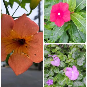 ノウゼンカズラ一輪 日々草 ランタナと緑の実 百日草 ピラカンサの赤い実 帰り道…