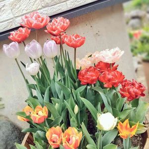 🌷チューリップ🌷 𖤣𖥧𖥣。𖡼.𖤣𖥧𖡼.𖤣𖥧⚘𖤣𖥧𖥣。𖥧 𖧧𖤣𖥧𖥣。𖥧 適当に植えたら高さがまちまち。だけど可愛いからOK😍 某ネット注文でGETした見切りチューリップ福袋より。