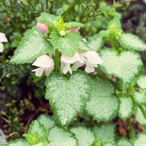 ラミウム ラミブラッシュ ピンクパールより繊細な葉っぱ🌿 遠目からだとハート🤍に見えます お花も小振り🩷 やっと蕾が上がってきました ピンクのまん丸が可愛らしい😆 気圧頭痛か寒暖差頭痛か すごく頭が重い😔 休日の雨の日はダラダラと