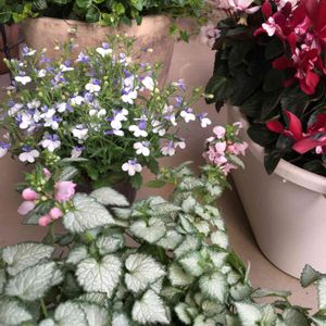 ラミウム・ラミと言うお花です🌸 シルバーの葉っぱと淡いピンク色が美しいです(お店で撮ったのでずらーっと並んでいます💗)
