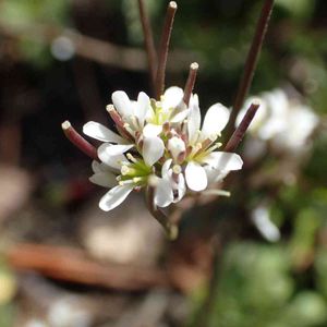 おはようございます。 今朝はミチタネツケバナです。タネツケバナの仲間で黒い果実(長角果)が花よりも上にまっすぐ伸びているのが特徴の一つだそうです。アブラナの仲間で十字花になっています。ヨーロッパ原産の帰化植物です。 2018/3/3 神奈川県にて撮影。 Cardamine hirsuta