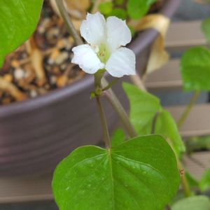 こんにちは☁ 🌿マメアサガオ🌿 GS繋がりの花とものmomoさんから頂いた鉢の中から、小さい白色の朝顔が咲きました🥰😍✨✌ どんな朝顔が咲くか、楽しみにしていました🎶 こぼれ種から、小さい小さいお花開花しましたよ🤩🤗 ✨💓🌿💓🌿💓✨