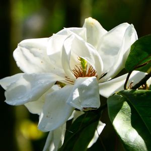 ミヤマガンショウ 深山含笑 モクレン科 モクレン属の常緑高木 中国原産 江戸時代に渡来 蔵前神社で ミモザと桜のコラボを見た後 どうしても会いたかった オガタマノキとミヤマガンショウに会いに小石川植物園へ行ってきました。 地域差や個体差などあると思いますが、私の住んでいる近辺では、 マグノリア(モクレン属)のお仲間の中で ハクモクレンより ひと足早く咲き始めるようです。 花期 2月中旬~3月中旬 1つ目 満開に近い状況だったので 大きな白いお花が 遠くからでも よく目立っていました。 花びら1枚の大きさは、長さ5~7㎝ ✕ 幅3.5~4㎝。 2つ目 葉っぱはこんな感じ〜 革質で光沢のある長楕円形 長さ 7~18㎝ ✕ 幅3.5~8.5㎝ 3つ目 芽鱗を脱ぎ、ふっくら膨らんできた蕾ちゃん。 4つ目 花径は10~13㎝ 程度 お名前の 深山含笑 は 中国名をそのまま持ってきたようです。 「含笑花」は、日本でカラタネオガタマと呼んでる木の中国名。 深山に咲く 含笑花の仲間ってことですね。 因みに「含笑」って、微笑みっていう意味だそう。 5つ目 葉っぱが落ちた花後の様子。 ハクモクレンやタイサンボクとよく似てますね。雌しべと、それを取り囲む雄しべ。 結実し 完熟までの様子、果実の成長をまた追っかけられるといいなぁ (果実の様子追っかけ観察 投稿 2022 2/13 ) 花言葉「甘い誘惑」 撮影 2024 3/3 小石川植物園