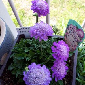 初めて 家にきた花です💚 スカビオサの紫に しました。 色は、赤と白と 悩み この 色に 決めました😊