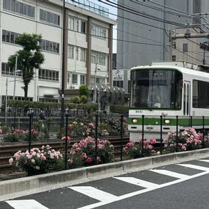 バラ🌹に囲まれる電荒川線、愛称東京さくらトラム(2017年4月28日決定) 荒川区の三ノ輪橋停留所~新宿区の早稲田停留所を結ぶ路面電車 沿線には多くのバラ🌹が植えられており、荒川バラの会(愛好家によるボランティアグループ)が維持管理しています。