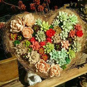 今日はバレンタインですから❤ 粘土繋がりでもう1pic✨ 昨年作ったハートのリース、 多肉ちゃんは全て粘土で作りました。 昨年の今頃に「デコトコノマ展」という、 お正月飾りを撤去した後に飾る床の間飾りを 色々な作家さんが掛軸とオブジェで彩る!という展示会に参加させていただいた時に 作った掛軸に使ったものを分解して(苦笑)リースに戻した物です😁