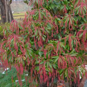 散歩にて🚶♀️🚶♂️🚶 アセビ 上の方の葉が赤くなっていて 遠目に花が咲いているみたいに 見えました😉
