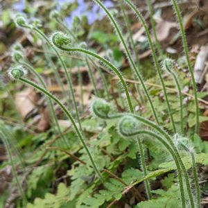 イヌシダ コバノイシカグマ科 コバノイシカグマ属 山の崖のような斜面に自生していました。 小型のシダで展葉前の新芽の短毛とクルクル巻いた姿が可愛らしいです。 薄紫色のタチツボスミレもイイ感じです💜
