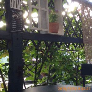 手作りテラスカフェコーナーですが台風一過でやっと朝日が差し込んで来て逆光が清々しくて一枚パチリ📷