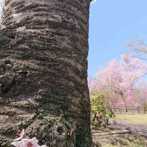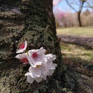 桜の並木道にて。 大きな桜の木の根元から小さな小さな桜