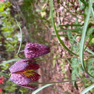 こんばんは~🌠🙌🎶 今日もお疲れ様でした😌💓 この釣り鐘型でチェック柄のお花の名前を教えてください。 大きさはピンポン玉よりも少し小さめだったと思います。 少々毒々しい感じも…そんなこと言ったら可哀想かなっ!(;´゚゚)ゞ💦 ヨロシクお願い致します‼ 🙇 ★。+゚☆゚+。★。+゚☆゚+。★。+゚☆゚+。★ 回答を頂きました🎵 〈フリチラリア・メレアグリス〉 和名:コバンユリ ふーちゃんサン💗ありがとうございました。🙇