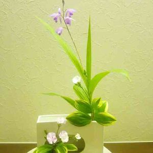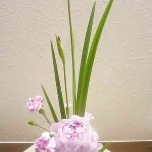 昨日の研究会のお花です。 及第点。 練習あるのみ、ですね。 花形 生花新風体 花材 花菖蒲(花3本、葉5組)