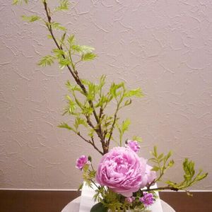 先日生けた自由花の芍薬が咲きました♪ お、大きい(笑) 枝を高く生けて正解でした(^-^) バランスを手直ししてパチリ。
