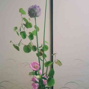 本日のお稽古花♪ おおらかに! 花形 生花新風体 花材 ギガンジューム、カンパニュラ、土佐水木