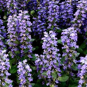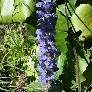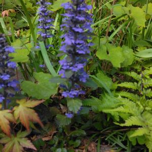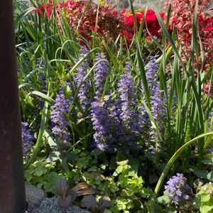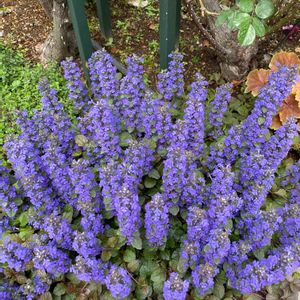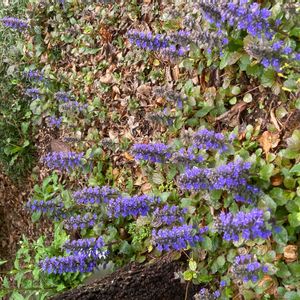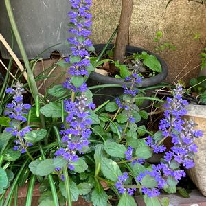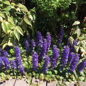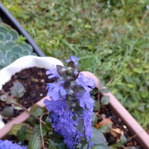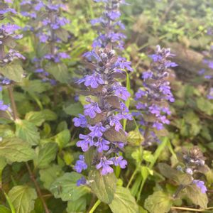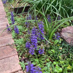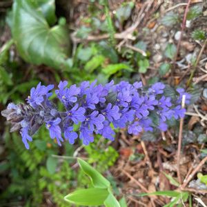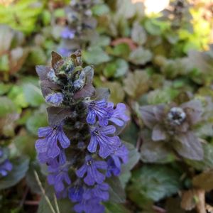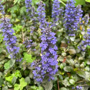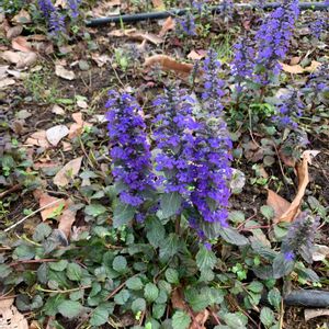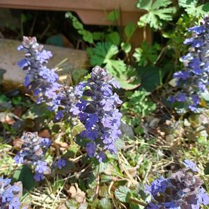 昨夜の雨で‥ 散らかったお庭の中でひときわ✨ 元気満開のアジュガ♪ セイヨウキランソウと言うのですね😊 そう言えばキランソウと‥ お花がそっくりだわ💕