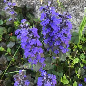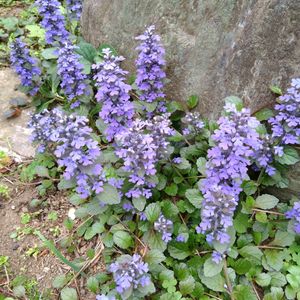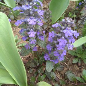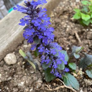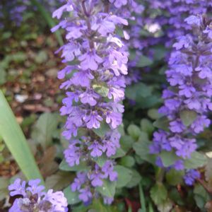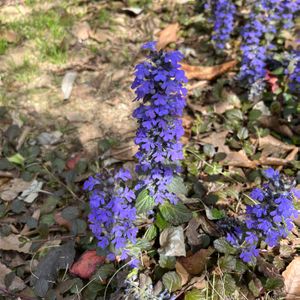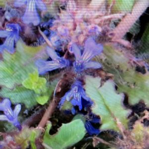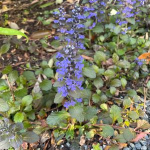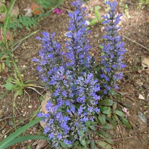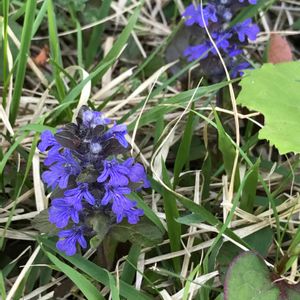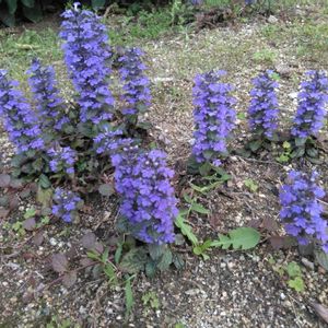 スーパーの花壇に青紫色のアジュガが品良く咲いてました
