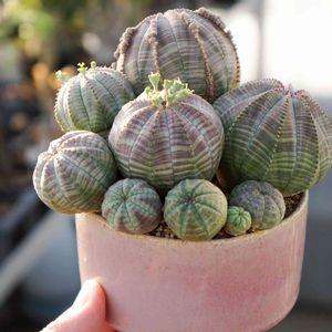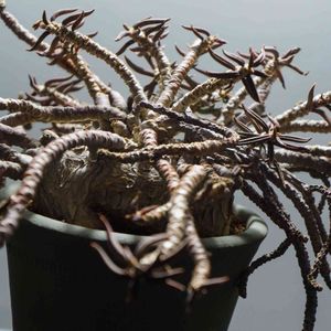 フスカ栽培失敗例 7月末に希少種ユーフォルビア・フスカの大株3株が我が家へやってきました。 2株は遮光しつつ屋外へ、もう1株は温室の中で管理。 すると3日間のうちで2度の夕立が。植えこんですぐ丸3日乾く暇がなかったことになります。 朝、様子を見に行くと何だか背が低くなっているような...。 内部から見事に腐っていました。 シュークリーム状態。 もう一方の株はほぼ水やりしていない状態だったので変わりなし。 サーキュレーターの風が一番当たるところを定位置に、ほんの気持ち程度の湿り気だけあたえて死ななければいいやと様子を見ていると、つい最近9月のお彼岸前の急激に気温が低下した時期にようやく動き始めました。 日本の夏、さらに根なしの状態がかなり過酷だったのでしょう。 春秋型なのかな…これから少しずつ様子を見ながら灌水していこうと思います。