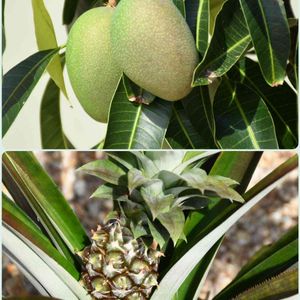 鉢植えのアップルマンゴーとパイナップルです🍍 アップルマンゴーは5年目で初めて結実しました😃 今はタマゴくらいの大きさです。この後どうなるのか、全くわかりません🤔😅 パイナップルは前回収穫して3年目です。この写真でも見えますが、葉の間から脇芽が出てくるので、これを育てています😊