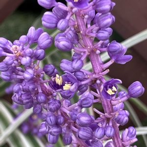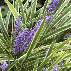 斑入りヤブラン 小さな花が咲き始めました ご近所さんちからやって来て… 日陰の場所で花も葉も美しいです💜