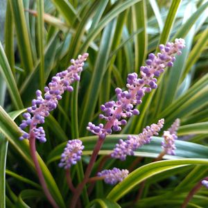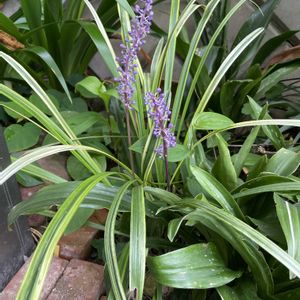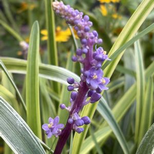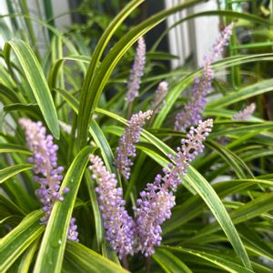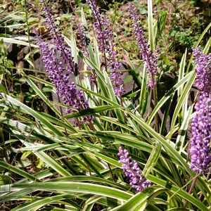 斑入りヤブラン(藪蘭) 科名:キジカクシ科(クサスギカズラ科) 属名:ヤブラン属(リリオペ属) 東アジアに分布する。 中国や朝鮮半島。 日本では全土、主に関東以西の本州・四国・九州・沖縄に分布する 段々庭のお花が少なくなるとこんな葉が伸びて紫🟣が目立つようになりました。 花が開くとまた可愛いと思う💕