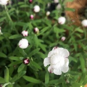 おきな草✿︎ 真っ白な花がひょこっと咲きました♪ 2年目の今年は直植えで🌱沢山咲くといいなぁ(⑅︎•ॢ◡︎•ॢ).。*♥︎