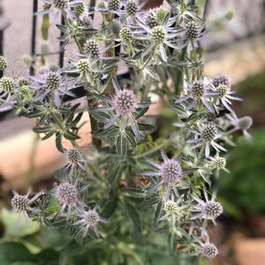 エリンジウム『ブルーホビット』 鉢を覆うほどの大きな葉っぱ🌱 個性的なお花で青く色づいてきました(*Ü*)ﻌﻌﻌ♥︎