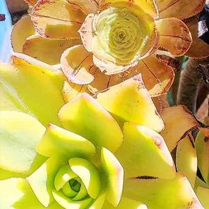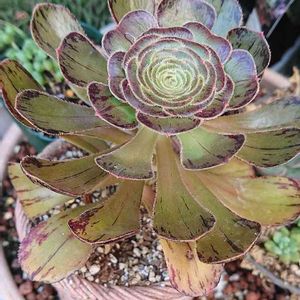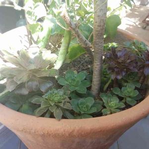 直径30㎝ほどの 大きな素焼き鉢 近頃はポイポイ鉢と化してる😄 元気の無かった アエオニウム達をまとめて 差したら、みんな生き生きしてきたような。 今日も朝陽が気持ちいい♡