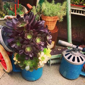トーチバーナーの廃材に植えたアエオ丼がもりもりしてきたー‼️ 黒法師も黒くなってきた💕