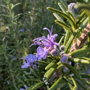 畑の北西側に自然に生えてきた ローズマリーです。 直立性でシュッとしています。 紫色の小さな花が咲いています。 蕾もたくさん出ているようです。