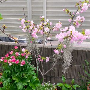 ~ 我が家の桜🌸が開花しました♪🙌🙌🙌 ~ 我が家にお迎えしてもう何年経つかな🤔 鉢で育ててるのですが今年も無事に咲いてくれました🙌🙌🙌 買った時のラベルに書いてあった品種名を忘れてしまいなんという品種だったか😅 花色がソメイヨシノに比べてピンク色が少し濃くてお気に入りです🥳 毎年鉢から地植えに切り替えようかどうしようか迷いながらも細長く狭い私の家の庭で巨大化してご近所さんに迷惑かけたらまずいと思い鉢植えのままでいます😆 せっかくなので同じく咲いたばかりのラナンキュラスラックスリュキアと大きくなり過ぎてそのままでは飾りきれなくなり株分けしたウスネオイデススパニッシュモスを遊び心で山の木々で見かけるサルオガセのように掛けてみました🤭