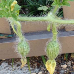 🍉花壇のフェンスに朝顔の様に 這わしてる🍉スイカ🍉 今年も実をつけました(^-^)/ 大きくなあれ💖 パック🐾 縁側からちゃんと 見張るんだよ👀‼️