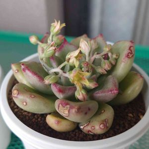 アルジェ繋がりで【アルジェ(親株)】 既に8程のお子様が独り立ちした、肝っ玉かぁちゃんのアルジェ🥰 2階のベランダに置いているせいか、すっかり緑😅 そろそろ植え替えないとなぁ……と思いつつ紅葉させたいので来年の春まで待とうかなぁ🤔