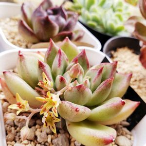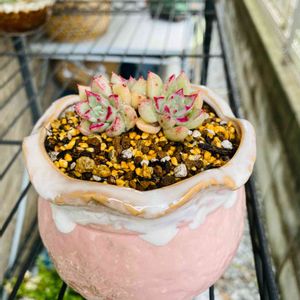 【アルジェ】 すーーーっごく子吹き易いアルジェ😁 ジュレもせず、ドンドン増えてます🥰 葉先がピンクで可愛い🤭 ロメオがジュレて凹んでるのはここだけの話……😓