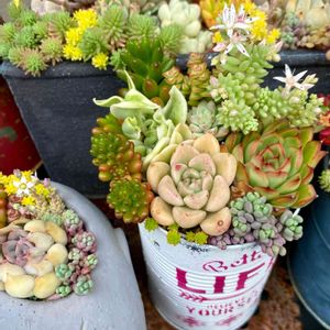 母の日に多肉植物の寄せ植えをもらいました。 お花みたいに見えるのを選んでくれたそうです。 色んな種類が入ってて楽しいですが、何て名前でしょうか?