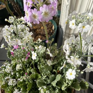 雲南サクラソウ こぼれ種からの発芽⸜(*˙꒳˙*)⸝ 1枚目 2階のベランダで一鉢で育てた雲南サクラソウ。 昼はお日様に、夜はビニール温室に入れておいたら花が咲きだしました。 2枚目 零れたねからの発芽を見つけ、3株ポット植えにしてましたが、花が咲き出したので、小さな鉢植えにした2株。 3枚目 ポット植えの一番小さな1株は、寄せ植えに入れました。 雲南サクラソウは、葉が素敵なので、花も葉も寄せ植え向きですねɢᵒᵒᵈ⸜(๑⃙⃘'ᵕ'๑⃙⃘)⸝⋆︎*💖👍🏻✨️ 今までビニール温室で過保護にしてたので、寄せ植えは、軒下に置いてます。