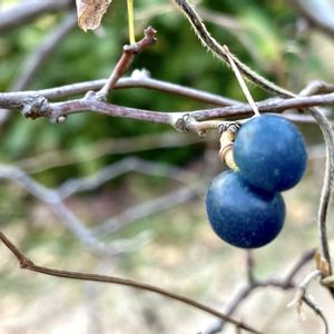 ★ ニコイチって なんか かわいいのよね ひょうたん繋がり アオカズラ 青蔓 別名 ルリビョウタン 瑠璃瓢箪 アワブキ科アオカズラ属の落葉ツル性木本 在来種 四国、九州に分布 (地域によっては絶滅危惧種) 小石川植物園の分類標本園で出会いました。 うわぁ きれいな色 しかも かわいい ニコイチ! 閉園間際に 急速テンション爆上がり。 トゲとツルで他の木に巻き付き伸びていきます。この枝が青い(緑色)ので アオカズラとお名前がついたそう。 へぇーそーなのぉー 私は てっきり この青い実からお名前が付いたのかと 思っちゃいました。 調べてみると 別名の ルリヒョウタンは 実の姿からつけられたようですね。(盆栽名) 春3月頃 小っさな黄色いお花が咲きます。1つのお花に2つの子房があるので 二つの実が対になりくっついて ヒョウタンのように見えることが多いそう。 子房の成長具合によっては1つだけってこともあり。後ろにぼやけて写ってるのは 1つですね。 緑 ( 赤を帯びることが多い ) から青緑、水色、青を経て 完熟すると濃青色になります。 花言葉 活力 芯の強さ 治癒 根気 努力 撮影 2022 12/4 小石川植物園 ★ ニコイチって かわいい ★ 食べて遠くへ運んでシリーズ