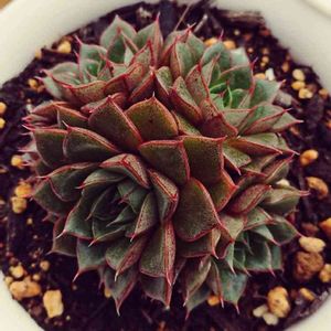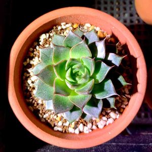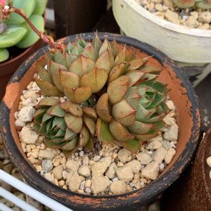 無謀にも上級者様を真似て、エケベリア丼🍜なるものを作ってみたら、案の定、夏を経て悲惨な状態に (。>д<) 今、引っこ抜いたこの子 最悪の環境だったにも関わらず、新芽が👶 ( ・ω・)∩シツモーン どなたかお名前を教えていただけますか?